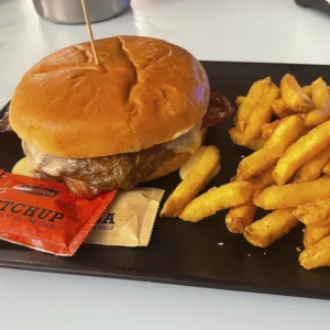 Cheddar, cebolla caramelizada, huevo y beicon.