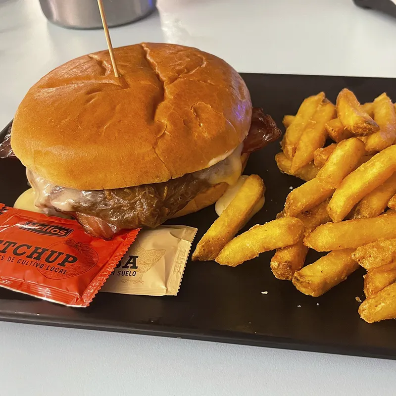 Nuestras hamburguesas artesanas, jugosas y llenas de sabor, llegan siempre acompañadas de patatas fritas crujientes.