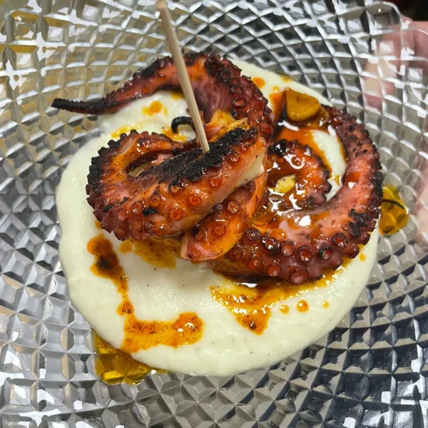 Medio pulpillo a la brasa con parmetier de patata, aceite de ajo frito y pimentón de la vera.